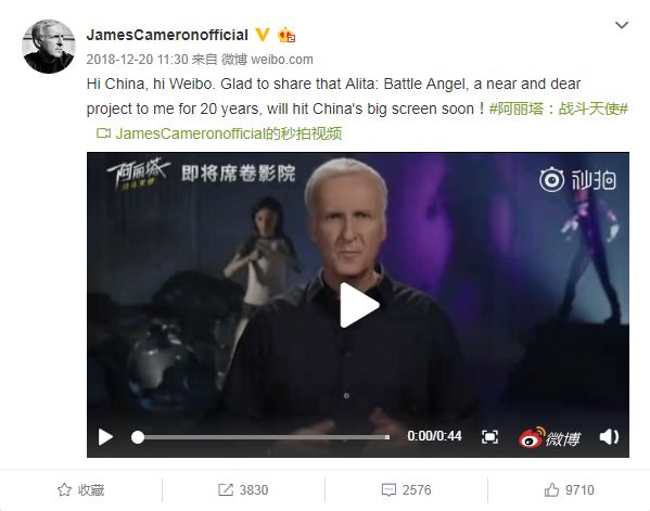 为了宣传这部电影,卡神可谓是费尽苦心。不但亲自来中国参与各种活动,还于去年首次开通了中国微博。目前,除了翻牌“小破球”的一条,几乎所有的微博都在为《阿丽塔:战斗天使》宣传。