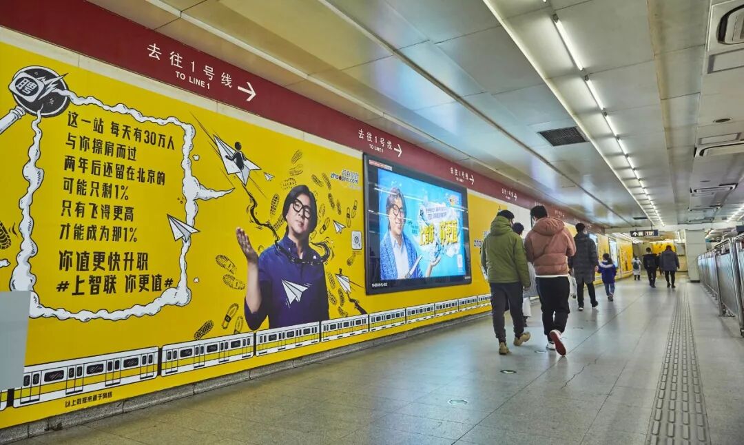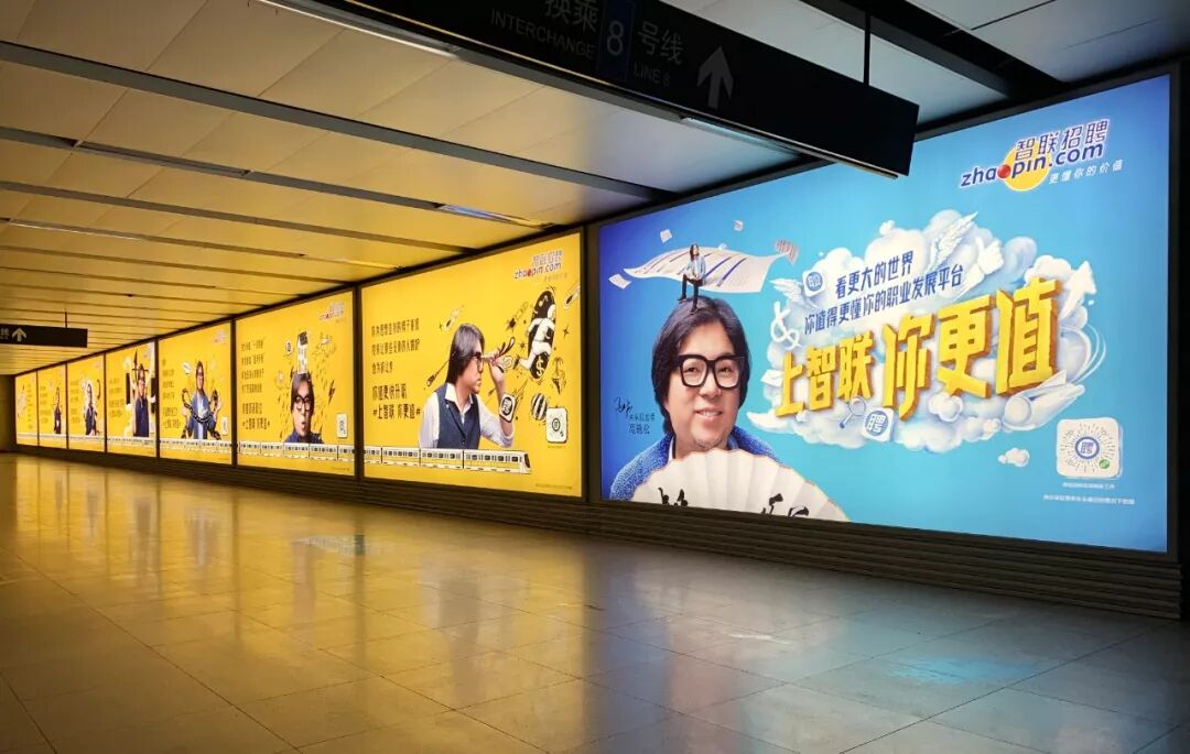 更进一步,将产品平面灵活运用在地铁场景化媒介。智联准确洞察特殊场景下的用户心情,将文案传达的核心放在“匹配情境”。当人们在等车的时候,对应出现“这里的下一站固定不变,你的下一站值得更好”,精准化地将智联提供更好选择的利益点融合,做到了有效的记忆和传播。