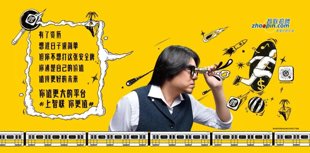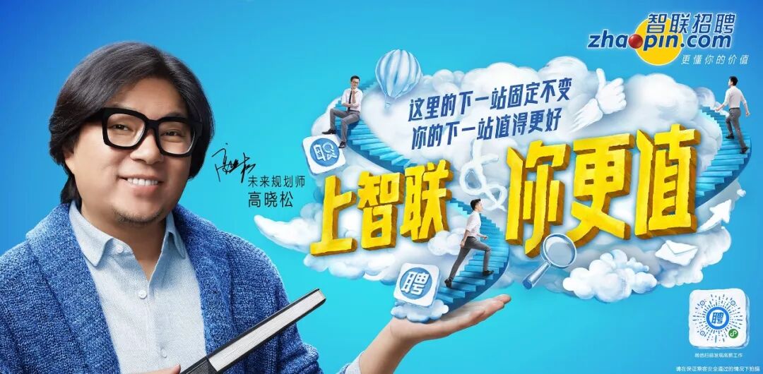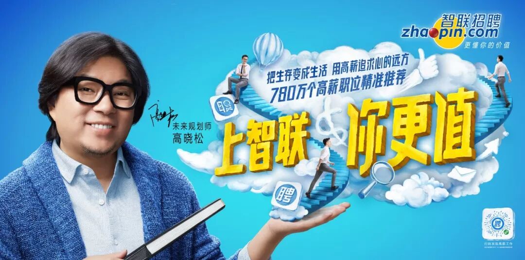 智联将高晓松年轻与成熟的两种形象运用在有诗意的广告画面里,配合突出化的“上智联,你更值”的品牌利益点,实现产品、品牌及代言人的紧密结合,加强了用户对智联新形象的认识。