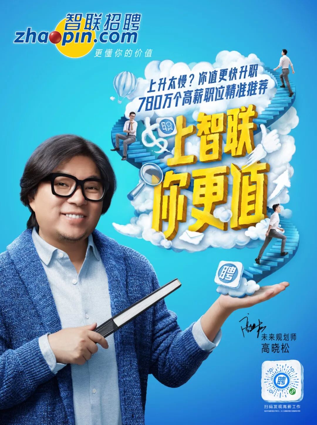这两年,《奇葩说》让高晓松变成了矮大紧。一个中年油腻大叔,既能一本正经大谈人生哲理,也能一言不合就自黑自嘲,凭借自身才华与魅力吸引了无数年轻粉丝的喜爱。不论是他写的歌,还是节目中说的话,都成为了年轻人随手转发的金句。才子身份,加上颇丰富的人生阅历,让高晓松“人生导师”的形象逐渐深入人心。如此一来,与智联“更懂你的价值”的品牌定位一拍即合。