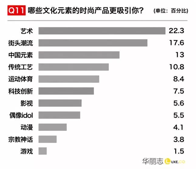 中国新生代消费者的全球化属性越来越强,「艺术」「街头潮流」是最受各个年龄段喜爱的文化元素,紧随其后的是「中国文化」。