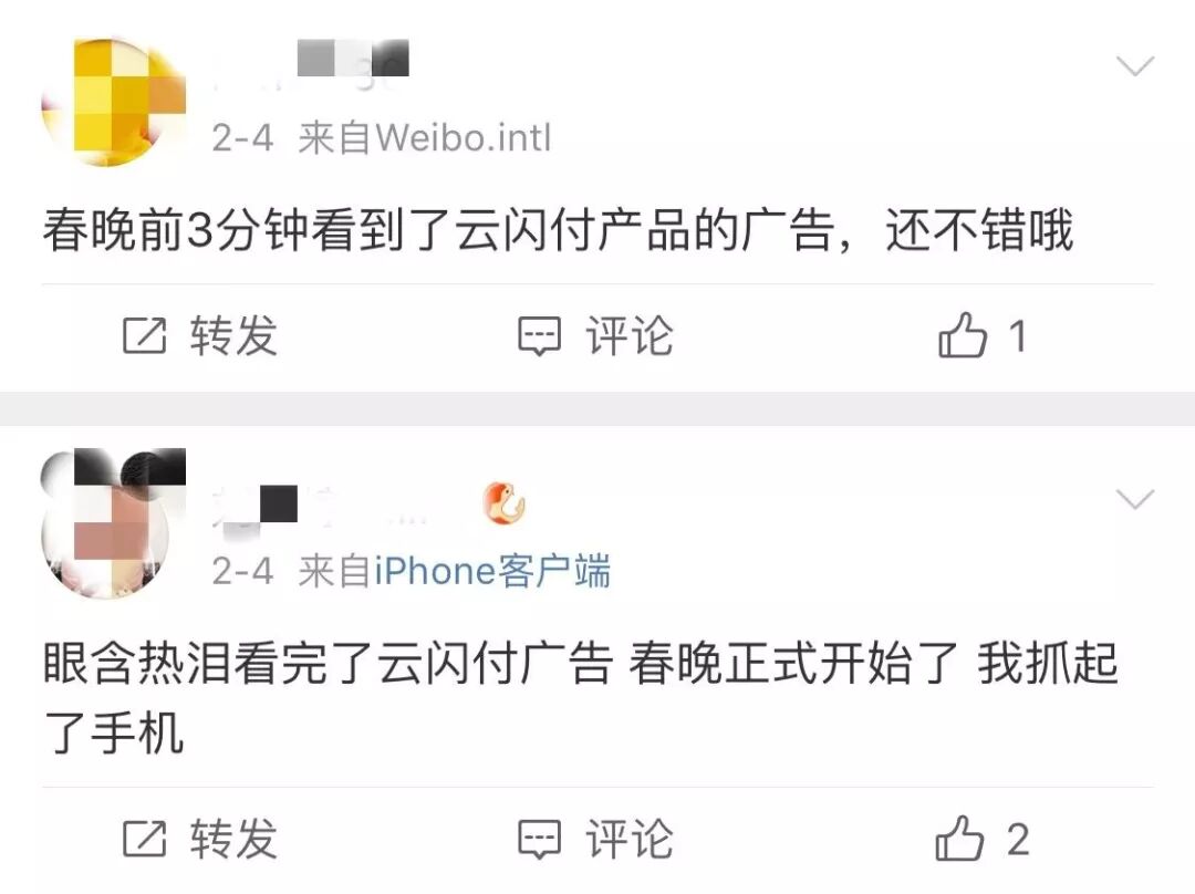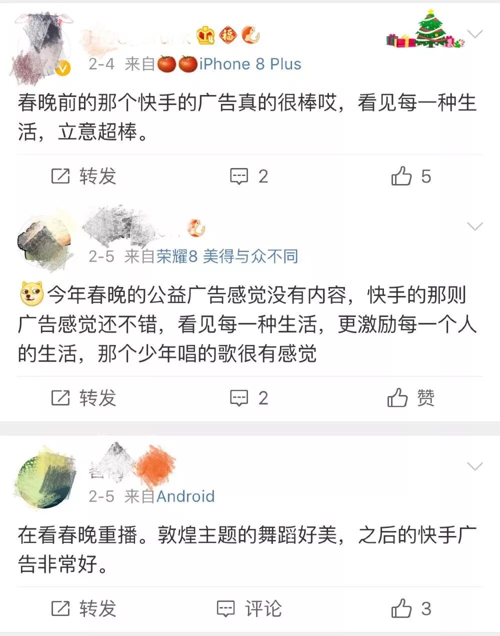 不言而喻,春晚广告的投放预算都是以“亿元”为单位计数的,那些攒着劲儿的品牌方和代理商当然希望“天价”的投放能带来更高的效益。其中的两个广告在当晚就受到了观众如潮的好评。一个来自快手,一个来自云闪付。