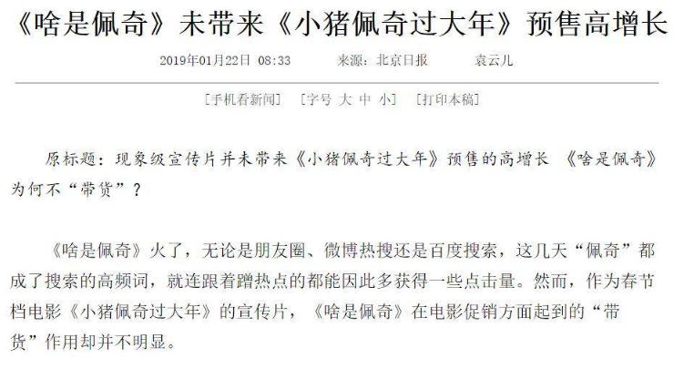 但是据《北京日报》报道:这部现象级宣传片并未带来《小猪佩奇过大年》预售的高增长。