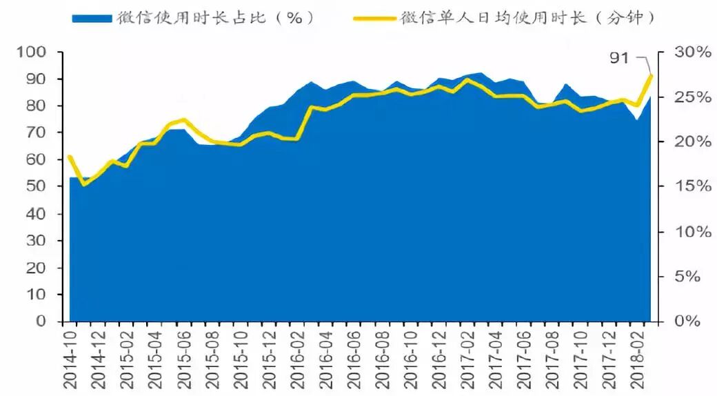 2014-2018年2月我国微信使用时长占比