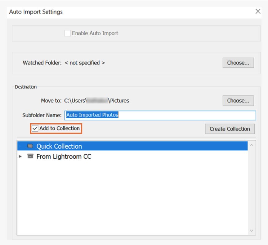 现在,“自动导入”功能可以监测选定文件夹中的照片,并自动将这些照片导入到你设置为目标的收藏夹中。当你在“自动导入”中设置了选定文件夹并指定目标收藏夹后,只需将照片拖至指定文件夹中。Lightroom Classic 会自动将这些照片导入到收藏夹中,从而跳过导入窗口。同时,还包括导入到与iOS或Android上的lighttroom.adobe.com或Lightroom CC同步的收藏夹。
