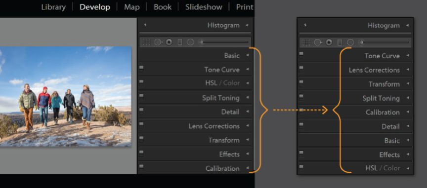 摄影师的工作流程和方式各有不同。新版本的Lightroom classic现在可以让你自定义“修改照片”面板中工具的顺序,定制个性化的操作体验。