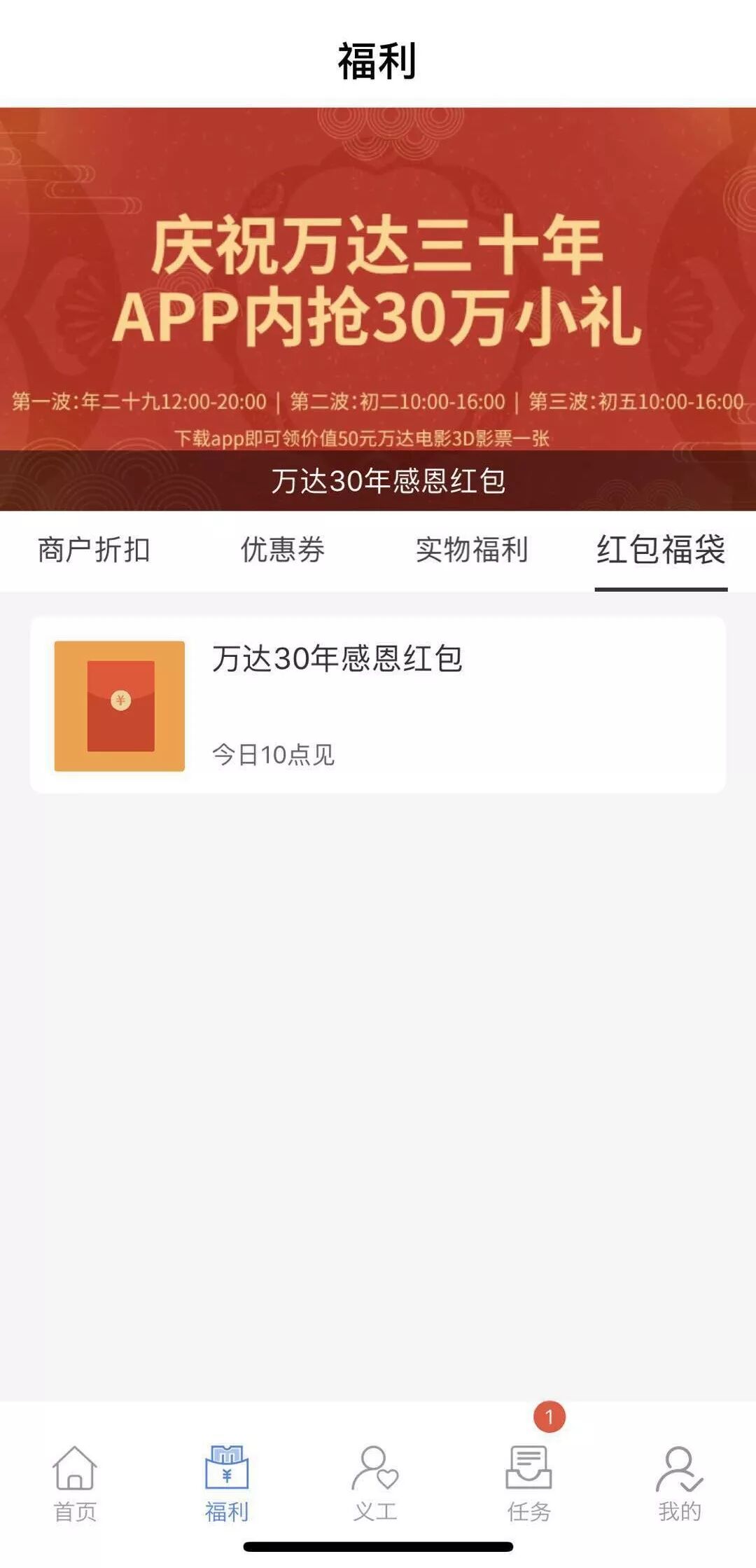 正月初五,破五迎财神,财运亨通一整年。庆祝万达三十年,万达给员工们送福利啦——30万元红包雨,正月初五(2月9日)10:00-16:00,第三波红包雨来了,千万别错过!
