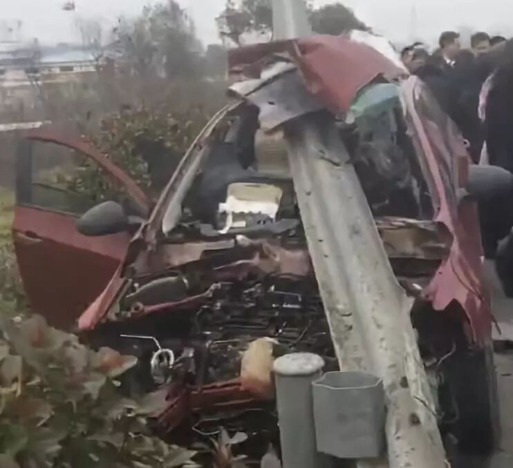 在途经204国道草堰镇红绿灯南约1公里处时,突然右后方一辆红色小汽车急速驶来,撞上道路右边护栏,轿车被护栏穿心而过。