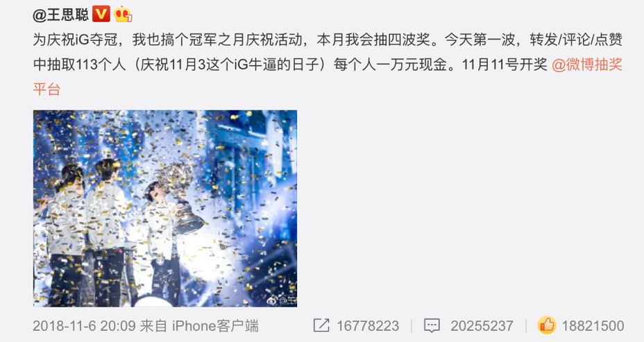 前有支付宝寻找中国锦鲤,后有王思聪用全民抽奖为iG夺冠庆功,微博抽奖功能算是彻底火了,当然该高兴的应该是微博平台本身。毕竟这年头,想开发并炒热一个新功能已经很难了。从去年十一开始,到王思聪11月6日宣布微博抽奖,这个功能就如同自动爆发一般开始在微博平台刷屏,“你抽我抽大家抽”的场面堪比当年微信用一个抢红包带火一个功能的热闹。不知道微博官方有没有兴趣把十一或者11月6日设为“微博抽奖功能”的年度纪念日,毕竟在娱乐至死的年代,敢玩会玩,顺势而为,很是关键。