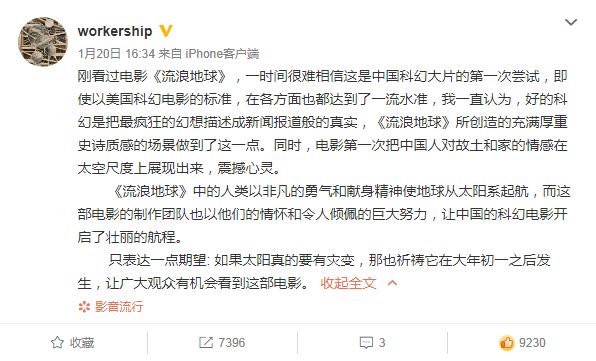 1月20日,大刘通过微博盛赞了这部由他的同名短篇小说改编的电影。2019年尚未走过一月,“年度十大科幻事件”的头一件就已产生。