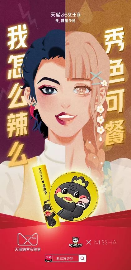 在这次三八女王节的到来,天猫跨界实验室发挥“作天作地做出成绩”的跨界精神,联合各大品牌一同以展现女性多面性为核心,从货品维度打造了 10 款跨界货品,并以 10 种不同的女性人设赋予产品更多情感色彩,将跨界营销再一次玩出了新高度。