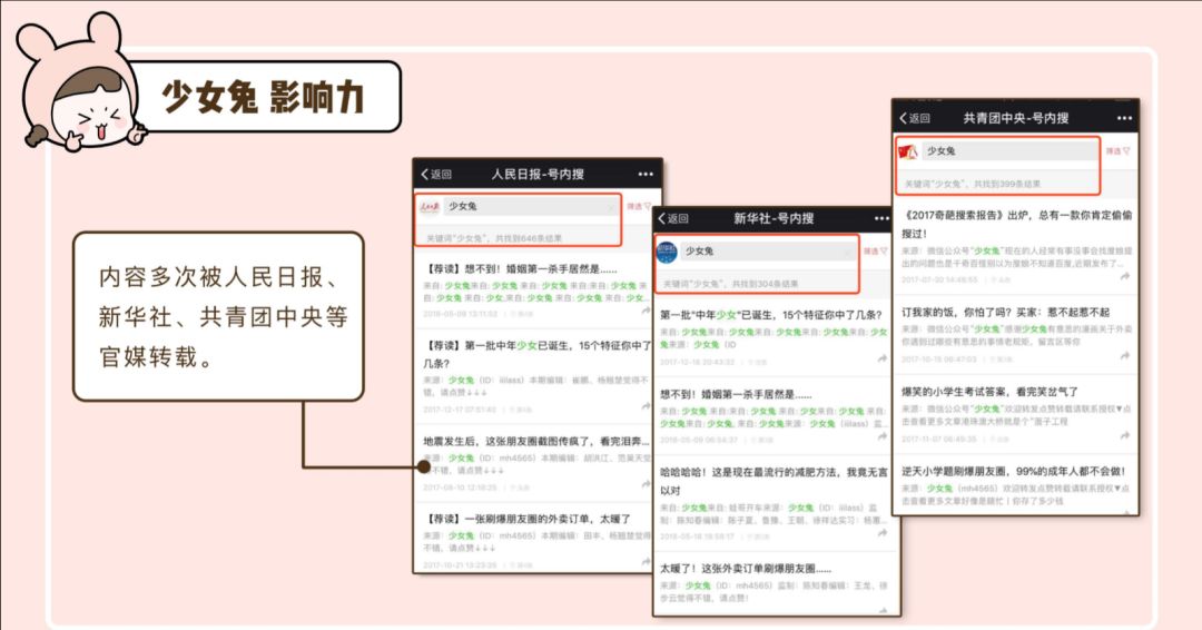 到这里也不难理解为何「少女兔」的不少文章会多次被人民日报、新华社、共青团中央等官媒转载。
