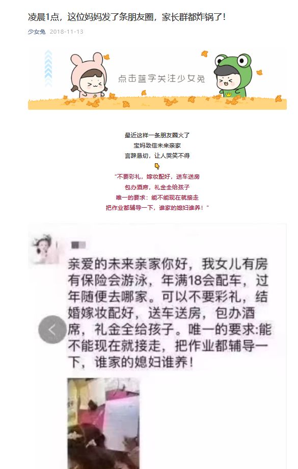 在商业化上,一直以来的爆款文章同样是「少女兔」变现的底气。最近的一篇《凌晨1点,这位妈妈发了条朋友圈,家长群都炸锅了!》的爆款内容,成功突破1700万,不光带来了巨大的曝光量,也在向广告主传达着「少女兔」品牌的影响力。
