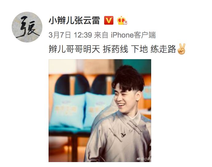 从进医院开始辫儿哥哥就一直在微博上和粉丝互动报平安,顺便发发美图小福利啥滴,3月7日直接亲自发博拆线啦,这也证明距离在舞台上看见辫儿哥哥的时间又进了一天,期待你回来的那天。