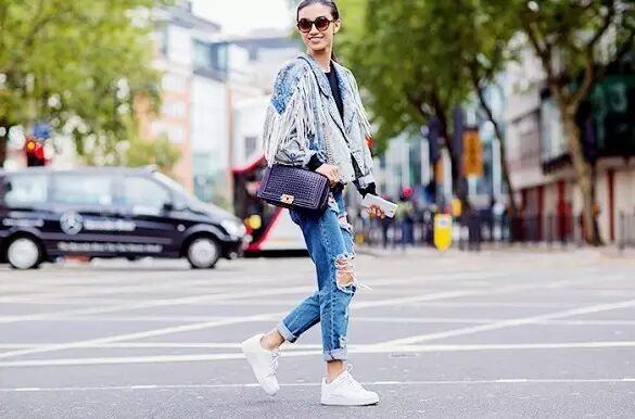 △ 男朋友牛仔裤+厚底运动鞋。这种穿搭的point在于把裤腿卷起来,露出一小部分的脚踝,显腿长更显瘦。