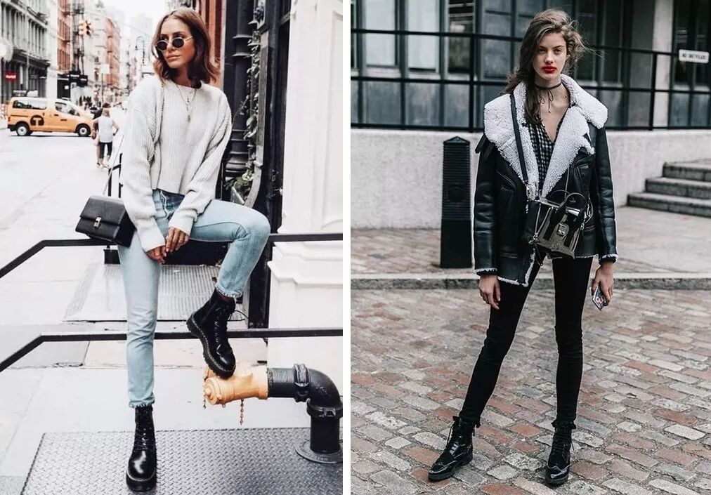厚底造型好看的不只有运动鞋,马丁靴的厚底造型也相当受欢迎。搭配九分牛仔裤,或者all black的顺色搭配,让你的腿更长,比例更好,衬托帅气的街头范也是霸气地刚好。