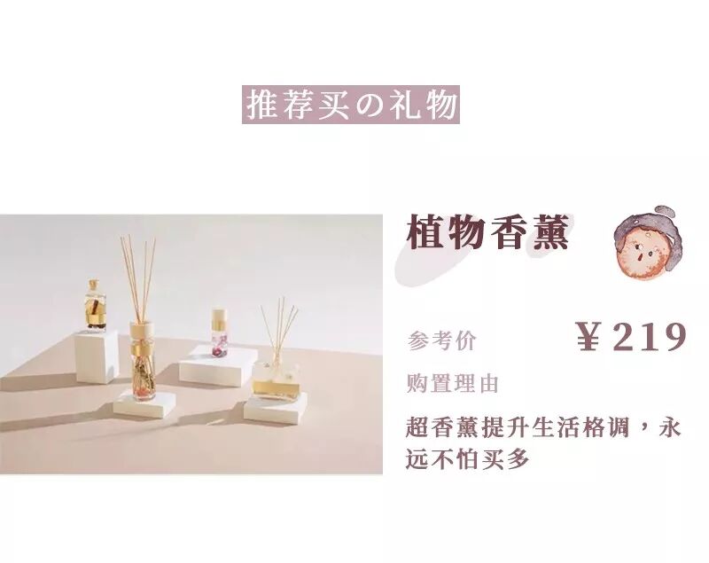香薰我自己平时也是非常爱买,野兽派的拔草过不少,它家的香薰主打的是植物镶嵌的类型,也有其它看起来非常性冷淡高端的单品,女生一般对这两种类型的礼物,喜欢的概率为:100%。