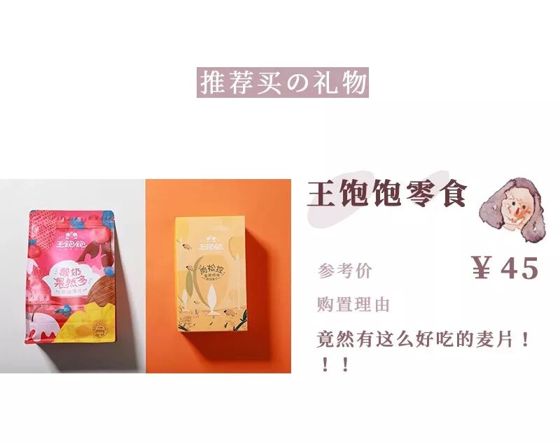 俗话说的好,管住女生的心,一定要先管住她的胃,送吃的是任何时候都不会错的选择!过年在家吃到的王饱饱系列超级好吃,之前欧阳娜娜也推荐过它。而且不只好吃,它还是很好的肠胃清道夫,每天早上冲泡牛奶,三分钟搞定一份丰富的早餐。