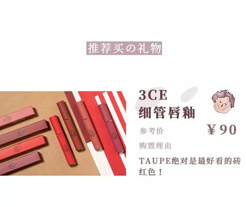 口红送女生当然必不可少,最近最火的口红我想就是3CE细管唇釉了吧。四支明星色TAUPE(砖红色)、DAFFODIL(豆沙红)、CHILDLIKE(脏橘色)、GOING ROGHT(蜜桃南瓜色)都非常好看,涂到嘴上你就知道多特别,虽然我已经有了一大盒唇釉,但3ce的这些颜色让我感觉它无可替代。尤其是TAUPE这支砖红色,在我所有砖红色系口红中脱颖而出,我实名封它为最好看的砖红色!
