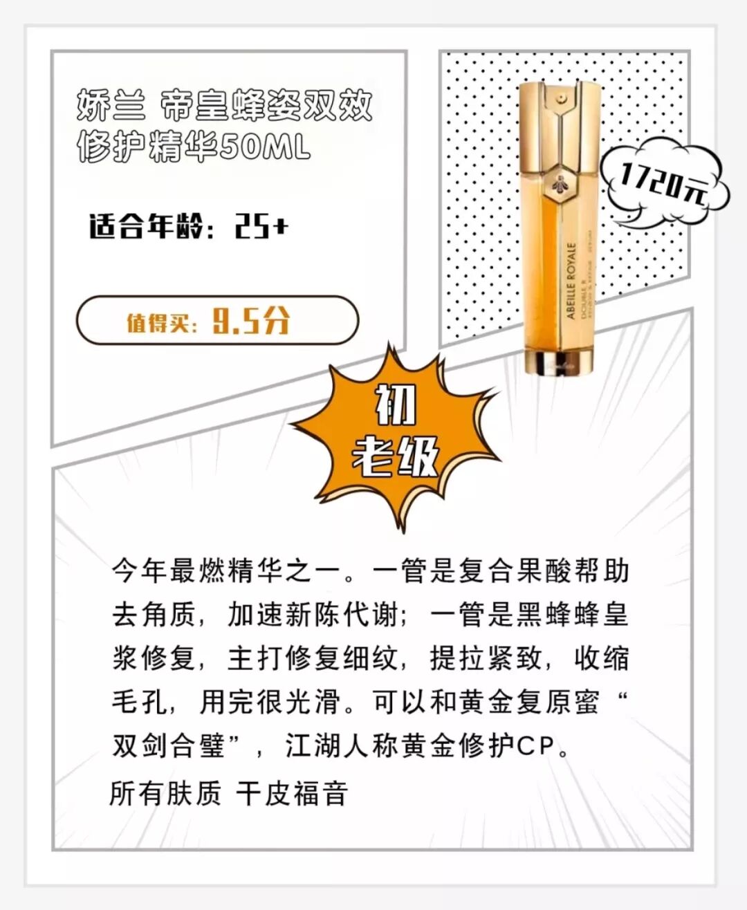 上次在《精华液合辑》里我有写到娇兰的帝皇蜂姿双效修护精华,我给它打到了9.5分