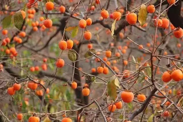 一树树果实累累的柿子,自然、盈实,透着一种喜气,像是挂满了橘色的小灯笼。