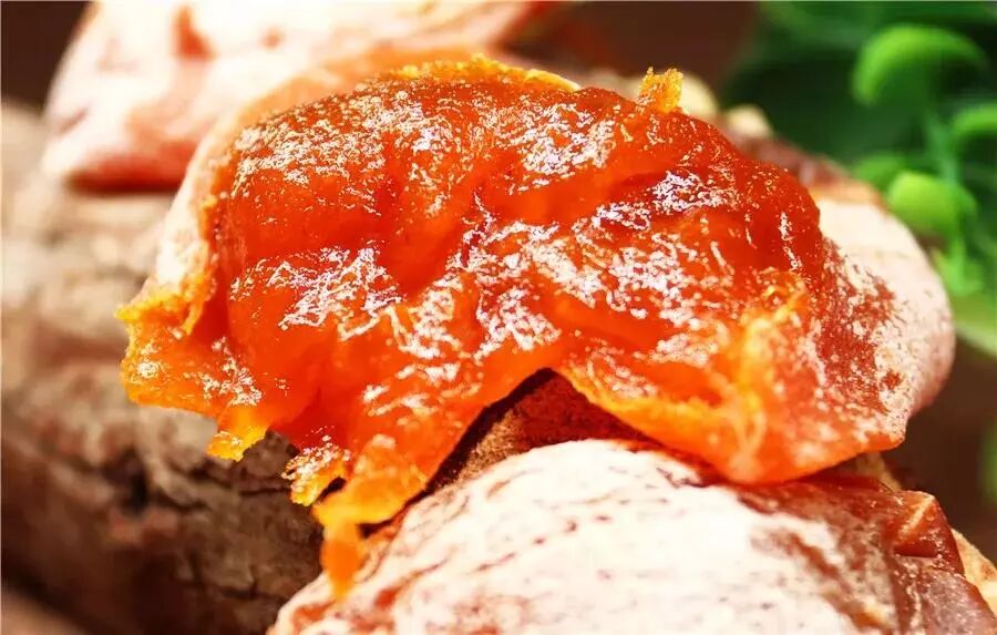 纯天然的柿饼被一层薄薄的白色糖霜裹住,这层白霜其实是果实水分蒸发后,从果肉里跑出来的果糖和甘露醇。