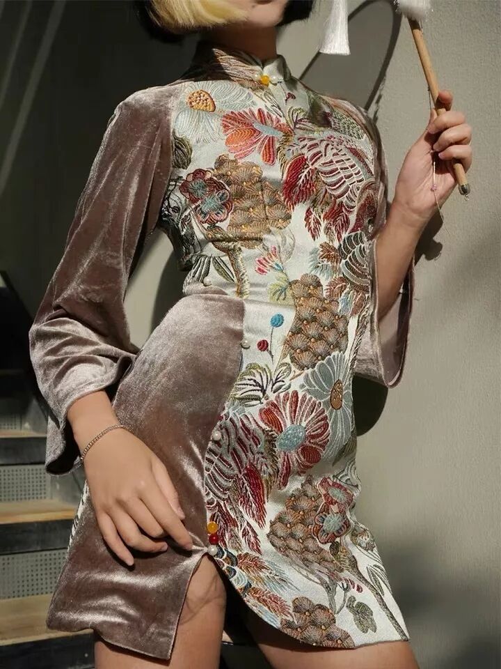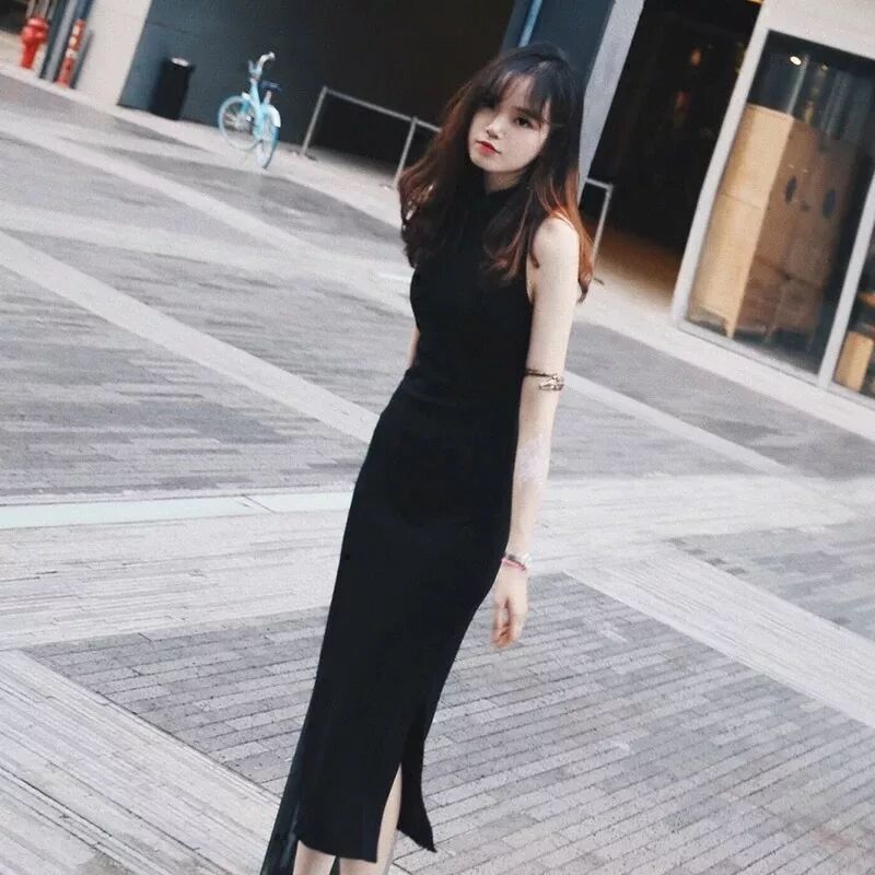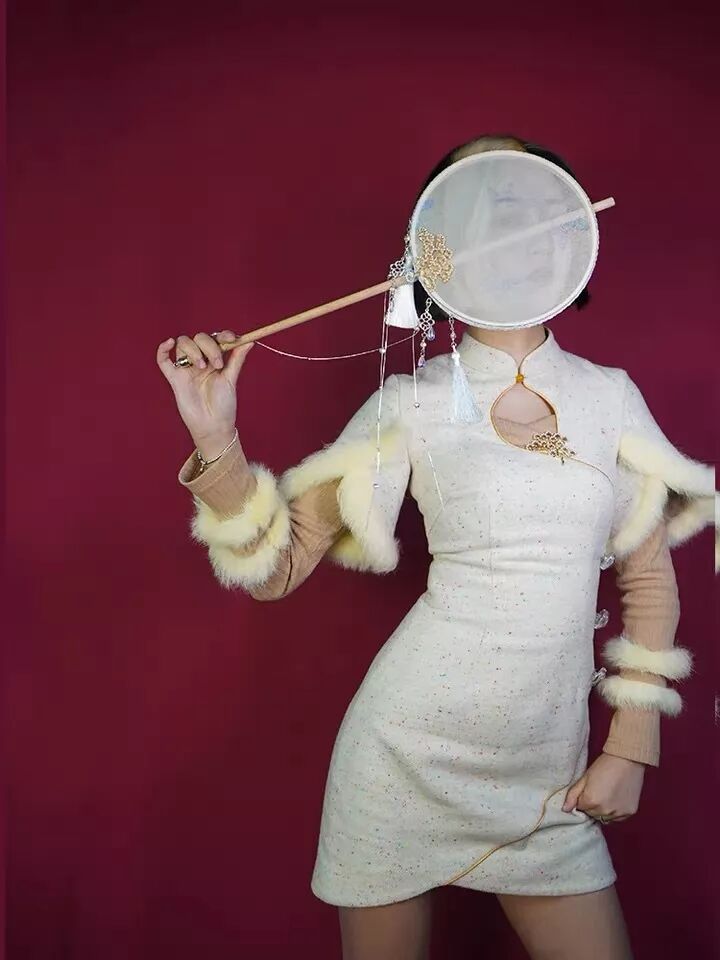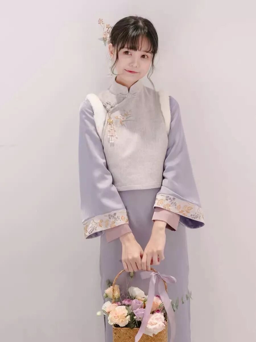 前长后短的旗袍,很适合和长裙做叠穿搭配。