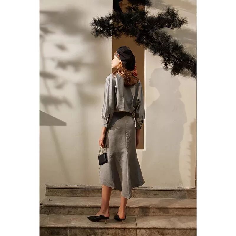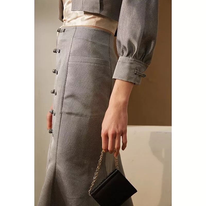 盘扣鱼尾半裙,跟现代风格的上衣也能很好搭配,优雅端庄。