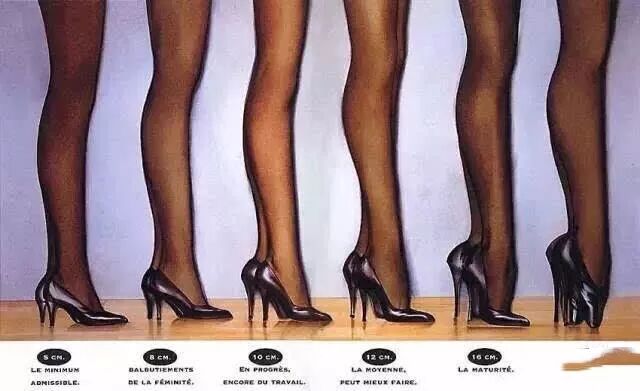 下面这张图相信很多人都见过,从5cm-20cm高跟鞋对人下半身体态的影响(包括小腿肚、腿长)
