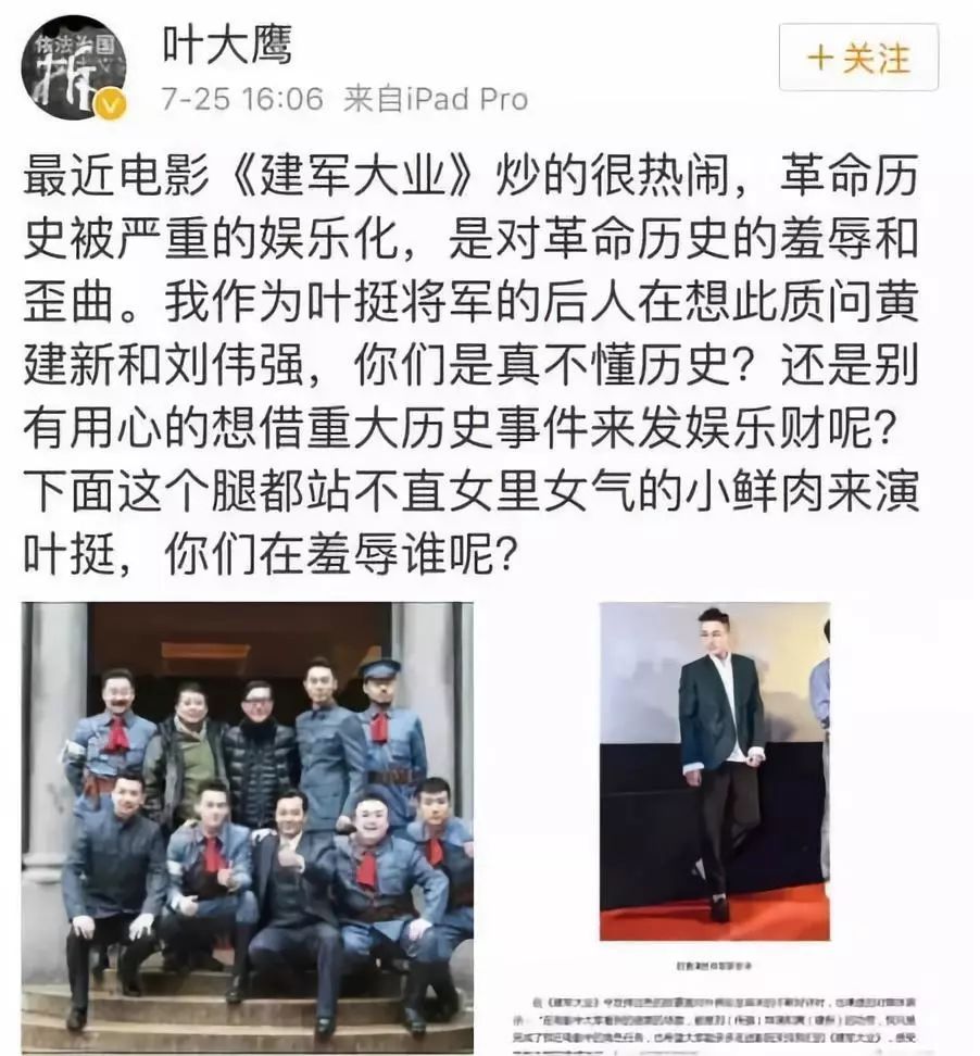 叶挺的孙子叶大鹰直接发问《建国大业》,为什么要用腿都站不直、女里女气的小鲜肉来饰演叶挺。