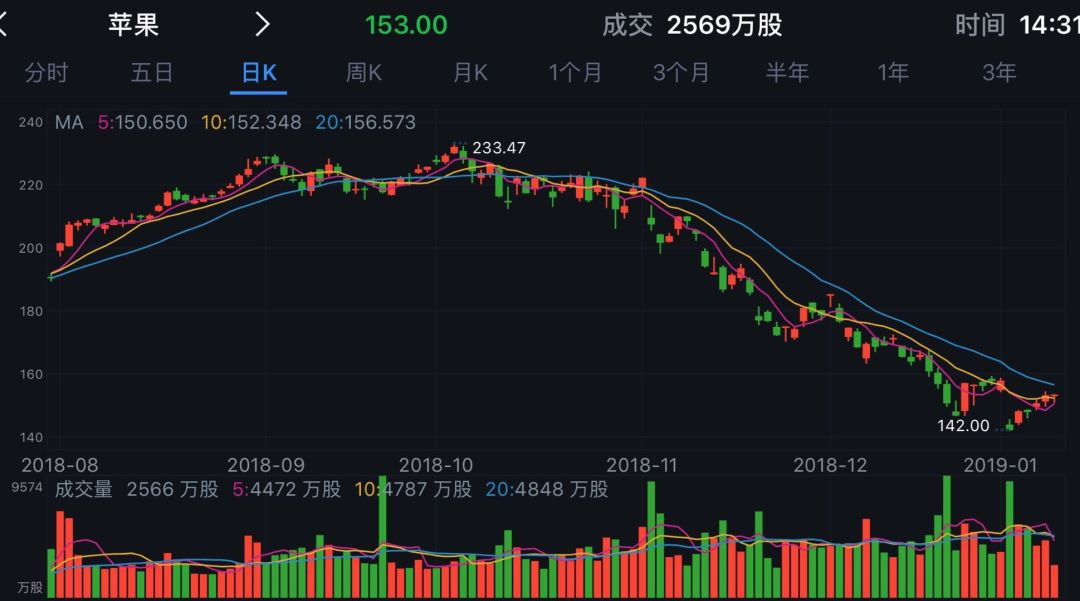 但随后几个月到现在,苹果的市值就一路下跌,截至北京时间1月10日,苹果股价仅为153美元,跌幅超过34%,市值蒸发了近4000亿美元