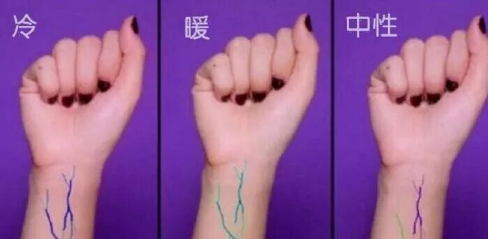 蓝紫色血管多的更适合冷色系,青绿色血管多更适合暖色系。两者都有的中性皮小仙女,什么都可以尝试的哦!