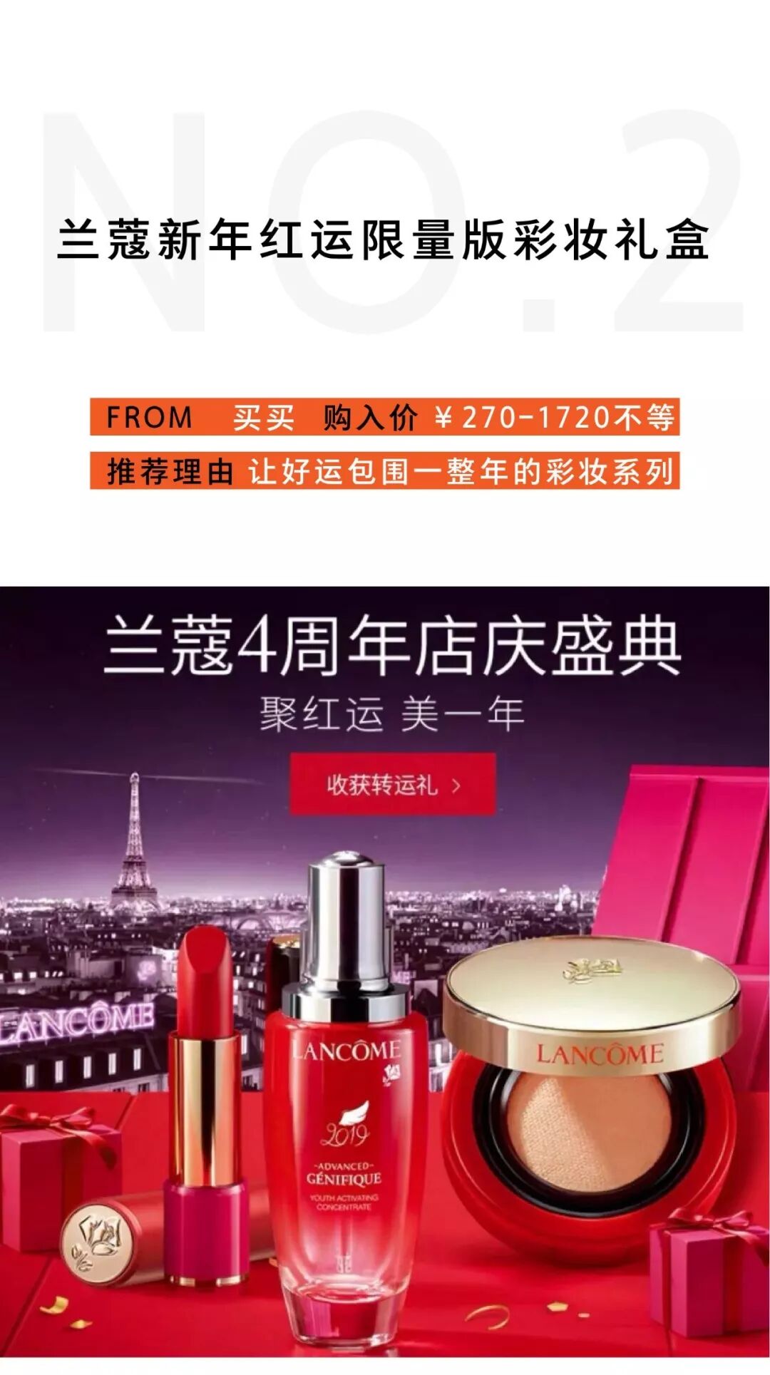 在13-21日的年货节期间,它还有买赠活动!13日的0点-2点还会有加享红包:新春大礼包哦!12-17日晚上还有不同产品的秒杀活动,我就准备蹲点13日19点-24点的小黑瓶(30ml)秒杀了,会送7ml小样`4+1ml单片`2,相当于买一赠一,优惠了50%啊!如果再抢到加享包,还会多赠送2个片装;14日19点-24点是唇膏和气垫的秒杀,有化妆包、钥匙链、眼霜、美容液、晚霜、大红包等赠品,算下来也有55%的折扣力度了!快计划下你的小算盘,来兰蔻领新年转运礼吧~