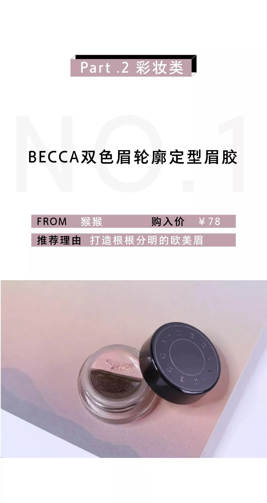 作为一个无眉星人,每年在眉毛上研究下的功夫很多。今年眉毛部爱用品推荐的是BECCA的双色眉毛定型眉胶。可以帮助你很好的打造欧美根根分明的眉流。