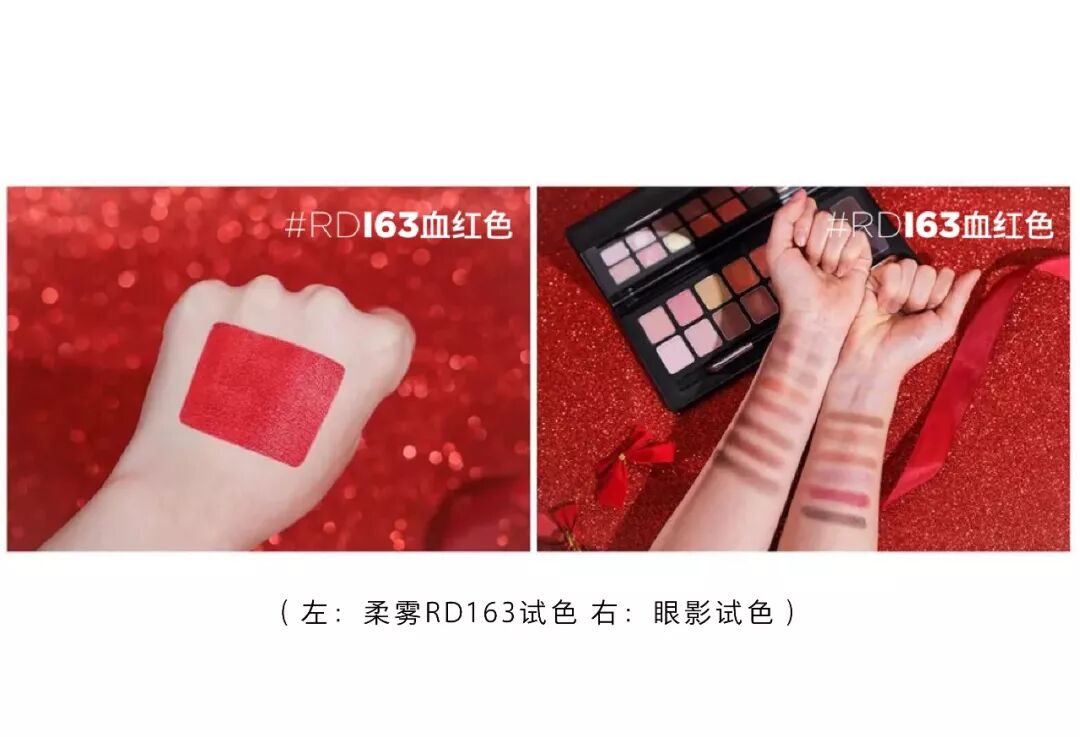 还想推荐几支口红跟眼影一起用,第一支:柔雾RD163。涂上是非常纯正的血红色,真的感觉是源自血液的红~就算你是大黄皮,它也能让你“转黄为白",整个人肤色立马好起来。另外两支是:滋润血红色水光RD163和俏皮感十足的OR570血橙色也都很合适跟这盘眼影一起搭,一下就把新年妆全搞定啦~