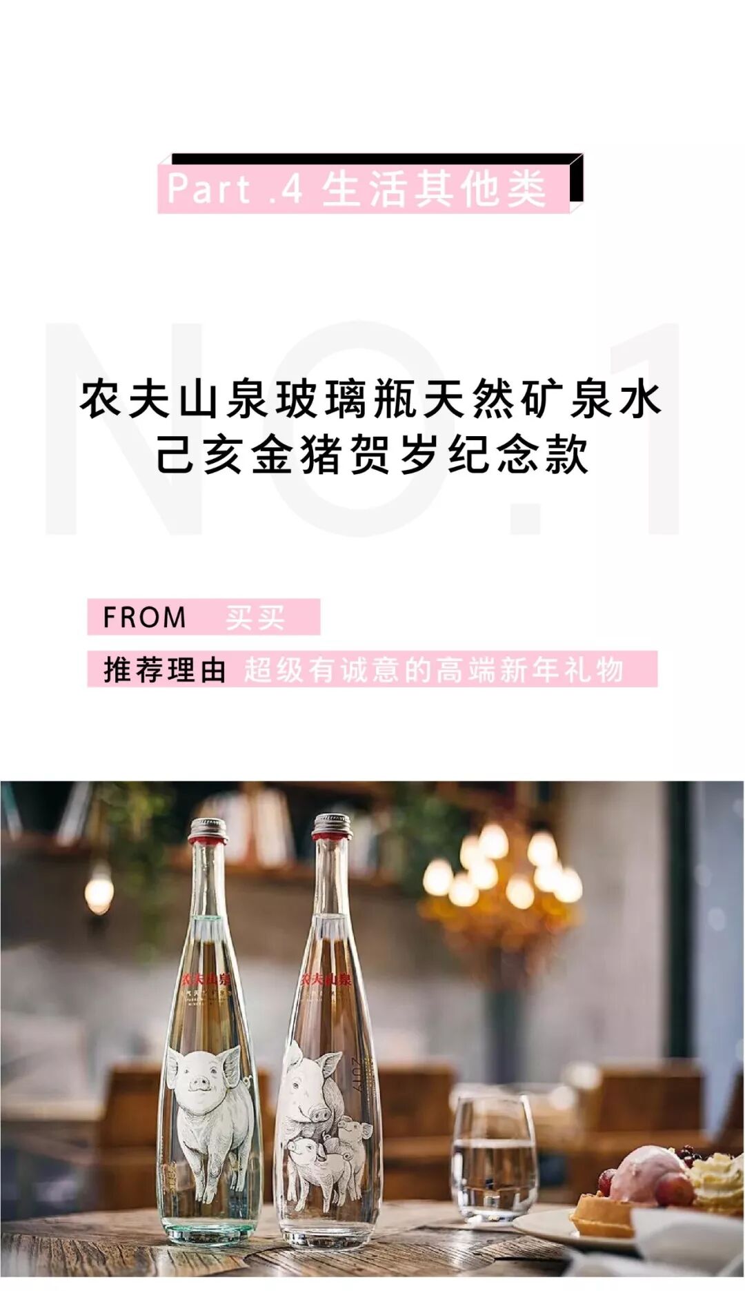 快到年底了,新年礼物要赶紧准备起来了,家人最期待的是居然是农夫山泉的金猪典藏天然矿泉水礼盒,里面包含一瓶充气和一瓶不充气天然矿泉水。从猴年起,农夫山泉已经连续四年推出生肖纪念款玻璃瓶礼盒,今年是萌萌哒的猪猪,全球限量20万套,依旧只送不卖!Ta可不是一般的矿泉水,而是来自长白山莫涯泉,那是很罕见的低钠淡矿泉的水源地。如果舍得喝掉,那口感尝起来是一种松软冰雪的味道。