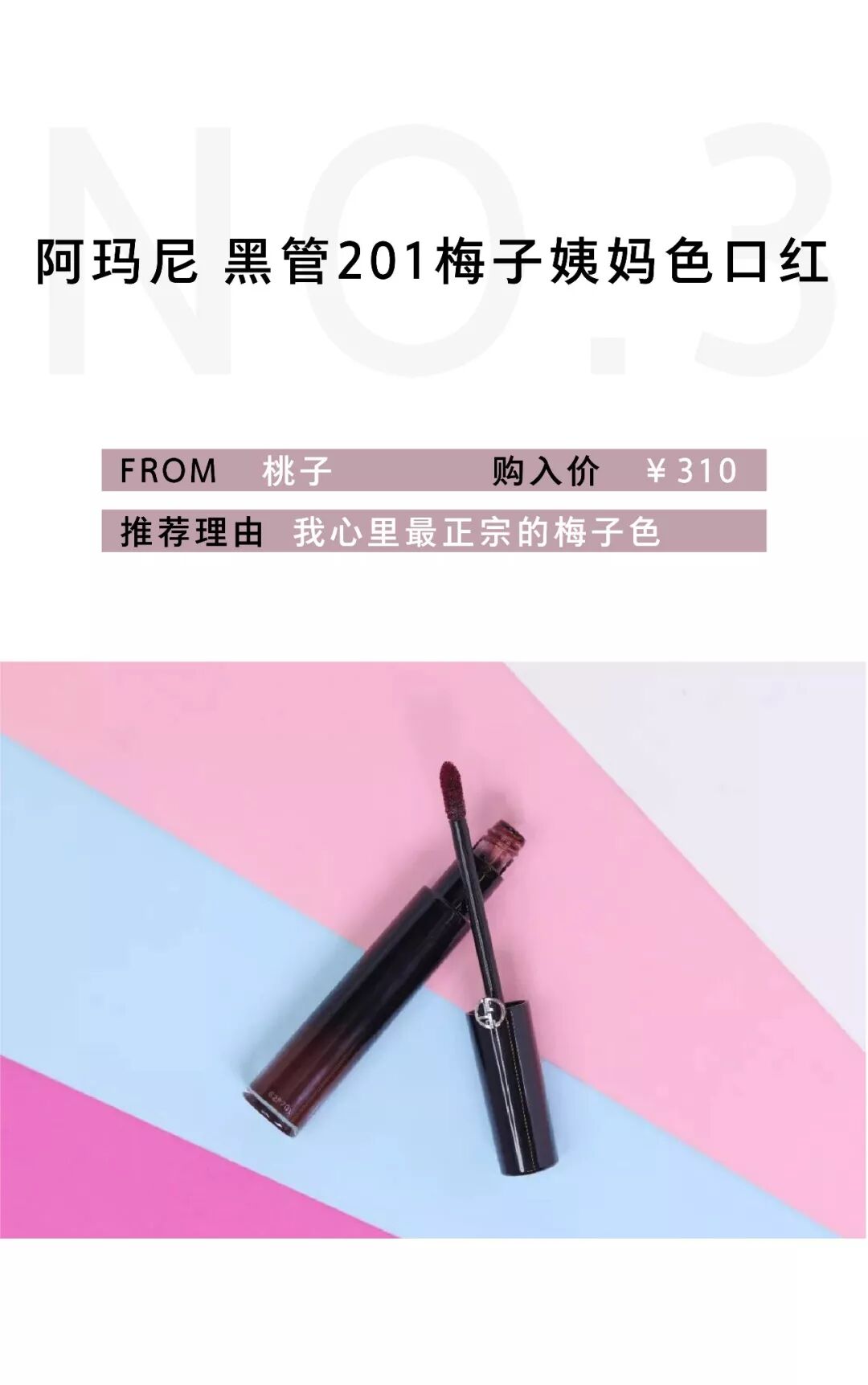这支阿玛尼黑管#201唇釉,妥妥的姨妈梅子色,上嘴精致的气场,完全就是我心正宗的姨妈梅子色代表了~大冬天用,不干也不沾杯,我真的要为它疯狂打Call!!!