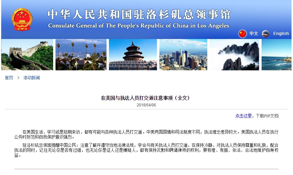 早前,驻洛杉矶总领馆在官网发布具体告示提醒中国公民,呼吁访美人士要学会与有关执法人员打交道,在保持冷静,对执法人员保持尊重和礼貌,配合执法的同时也一定要了解自身都拥有哪些合法权益。