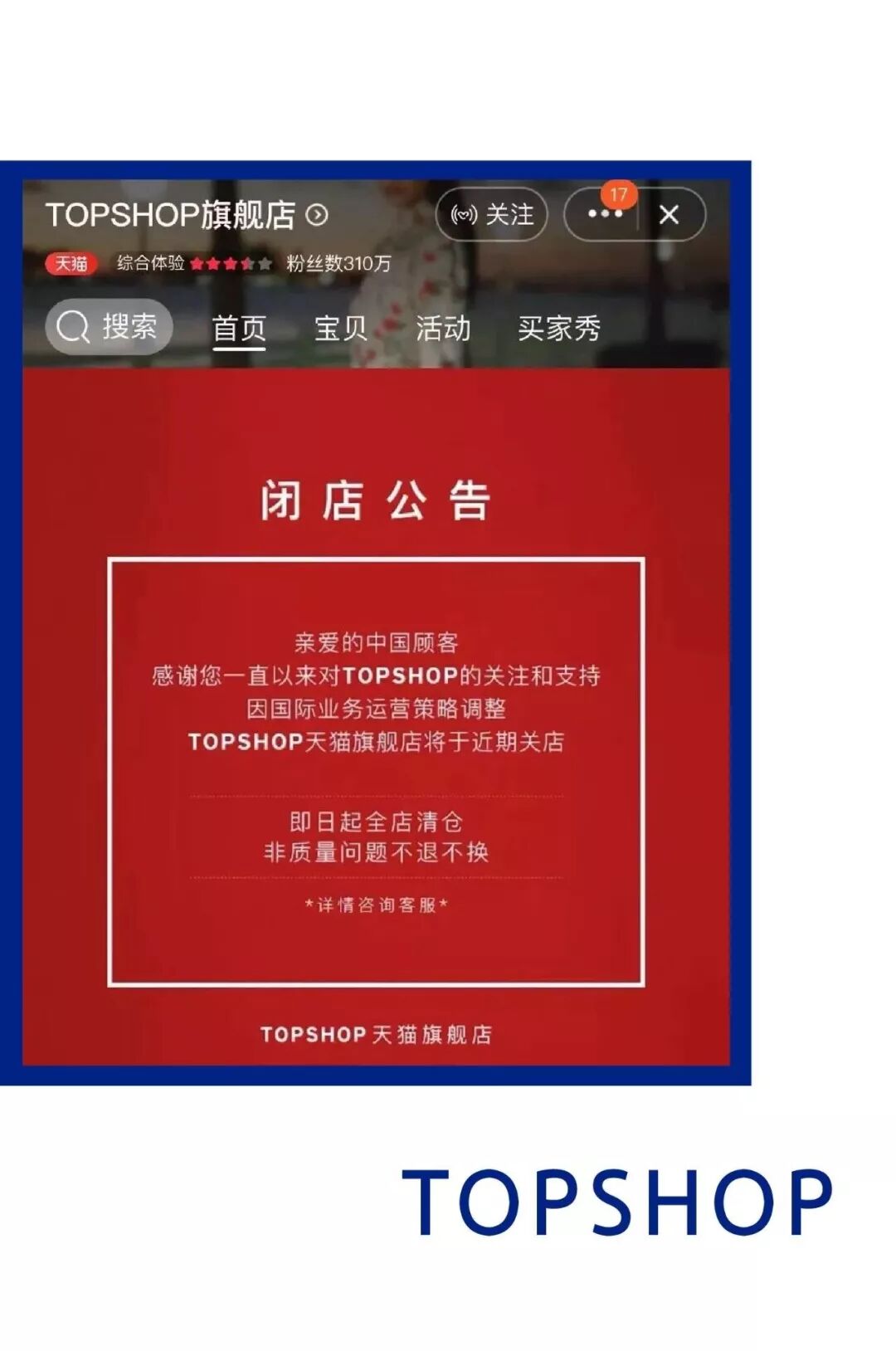 和梅西有着相似命运的TOPSHOP在前不久也宣布关闭天猫旗舰店了。