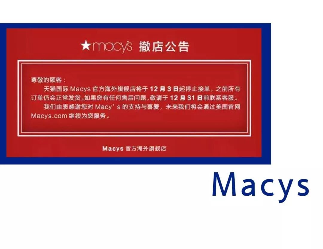早在去年电商法出现苗头的时候,海淘大户:梅西百货在12月3日就通过天猫国际macy‘s官方海外旗舰店发布撤店通告,店铺将从12月3日起停止接单。