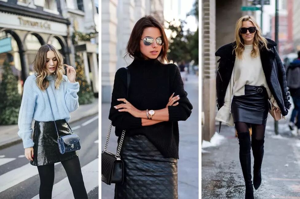 如果你觉得皮裙过于狂野,可以试试亮度较高的漆皮裙,它能营造张扬的时髦感,搭高领毛衣、小西装都很好看。