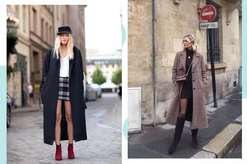 短裙的包容性很强,和什么外套都相配,但如果想要穿出大长腿的感觉,可以试着搭配搭超长大衣,利用内短外长的视觉比例,营造两米大长腿效果。