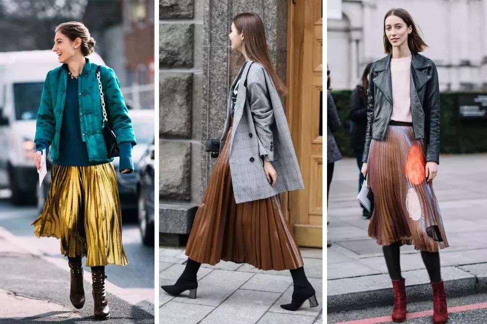 褶裙生成的裙摆较大,搭配长款大衣很浪漫,特别提醒个子不高的女生:选择裙长到小腿中部即可,不可过长,容易压个,再加一双高跟的靴子,女神气质立马升级。