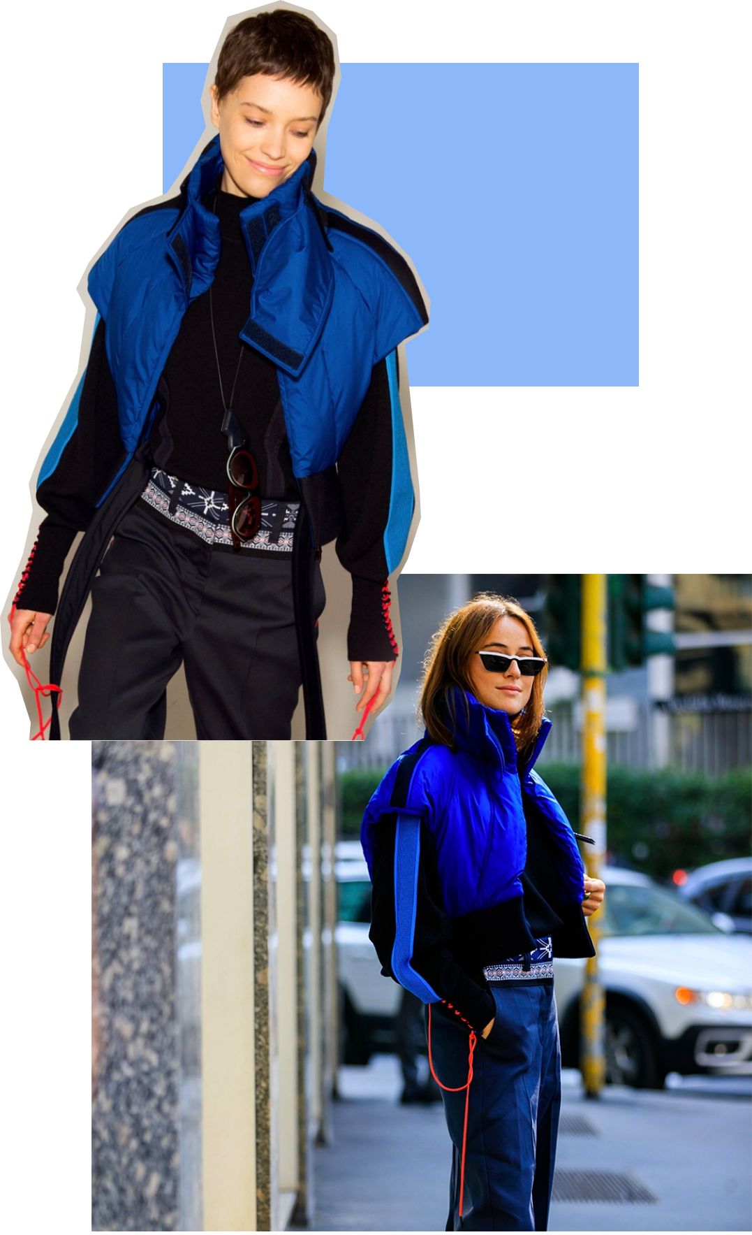 如果你还是对它家的超短款恋恋不忘的话,除了绿色那款,你还有很多别的选择,比如这件蓝色拼接针织面料的款式就很时髦,也很适合前卫风的look.