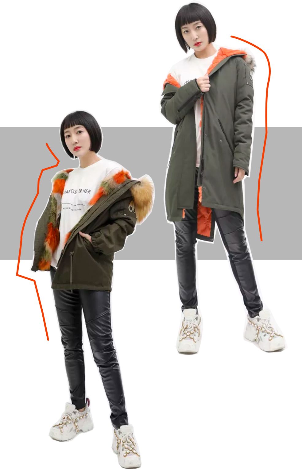 它还有个胜人之处是——不管什么长度,版型都是保持贴身修长的,没有臃肿的毛病。我给大家亲身示范了长、短两款,确实很修身