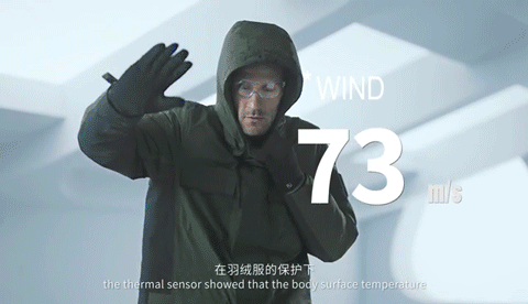 在这个风速下,男子却在风中神态自若。风停下来后,热感显示外套外面温度已经大幅下降,