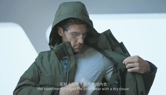 羽绒服的表面也在持续喷射下,也逐渐结了冰,但!!是!!男子扒开自己的羽绒服后,热感显示他外套内的温热依旧。