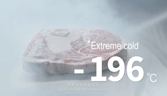 先来一段花絮,在这个温度挑战下,被液氮喷洒过的牛肉已经明显结冰、破裂,