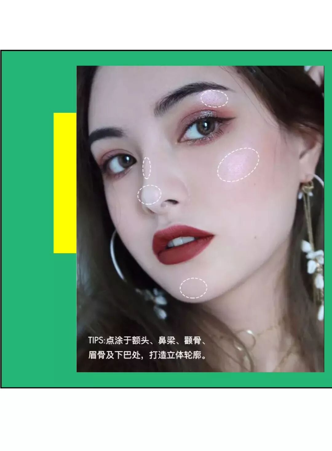 高光适合亚洲女孩的正确位置是颧骨、山根、鼻尖、唇峰、下巴、眉骨。鼻子和脸颊要配合打上阴影,马上就能让你的鼻子像打了玻尿酸一样~