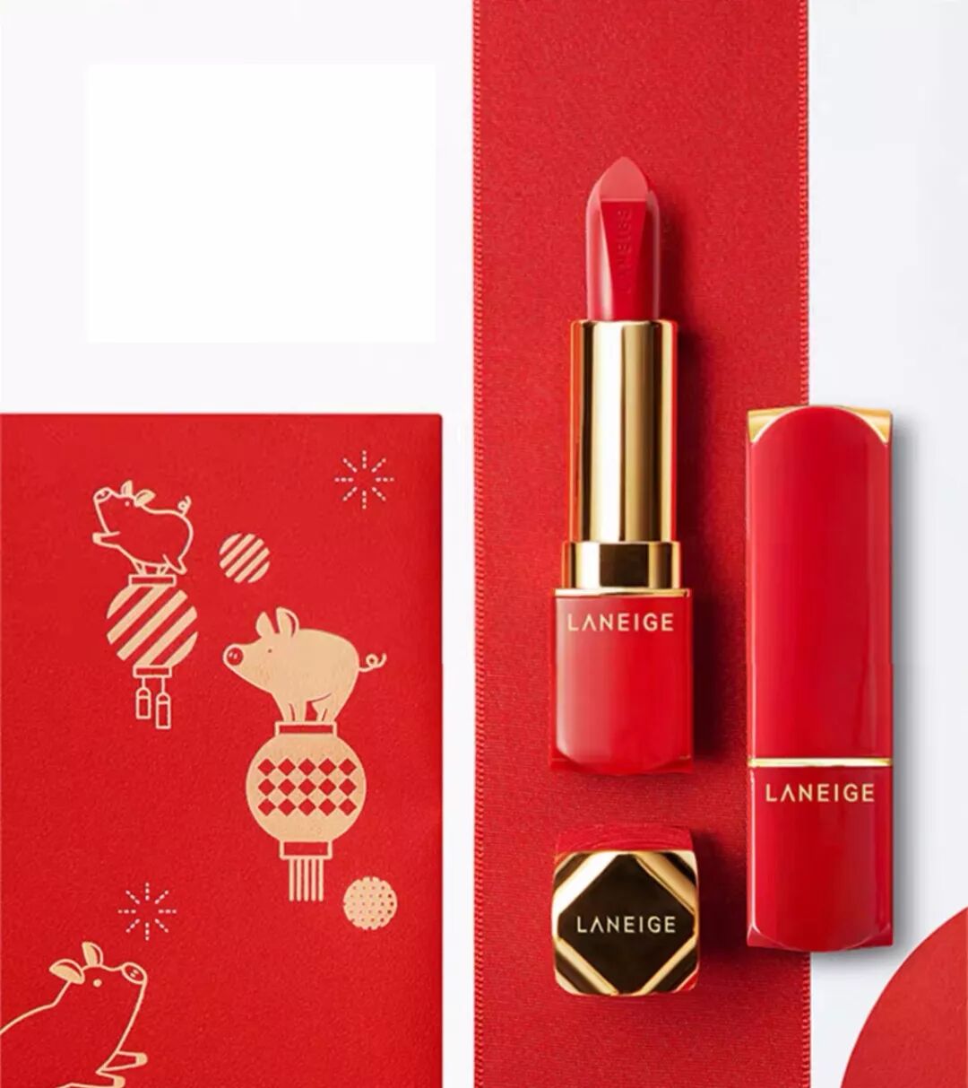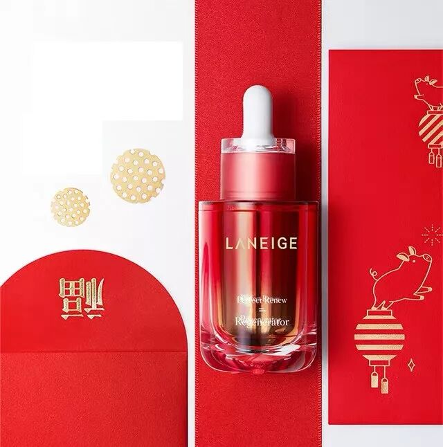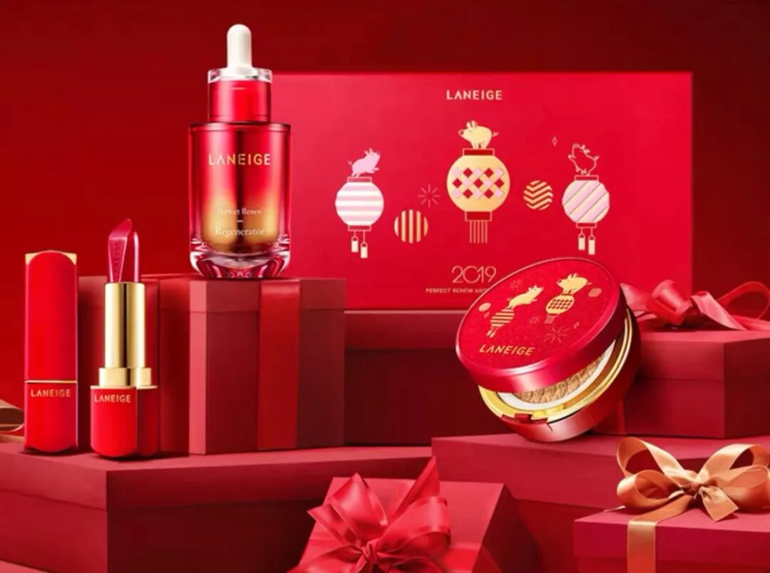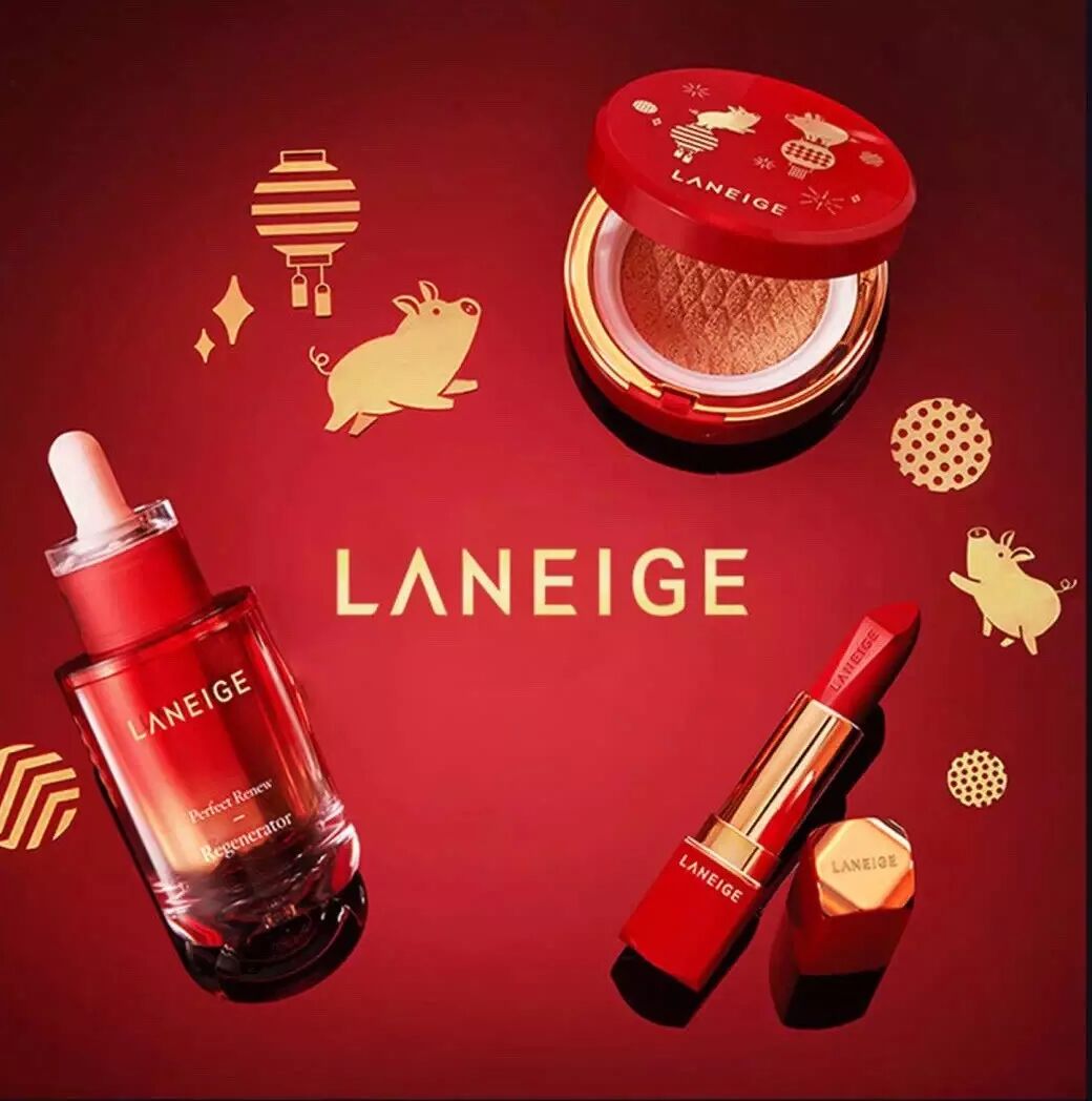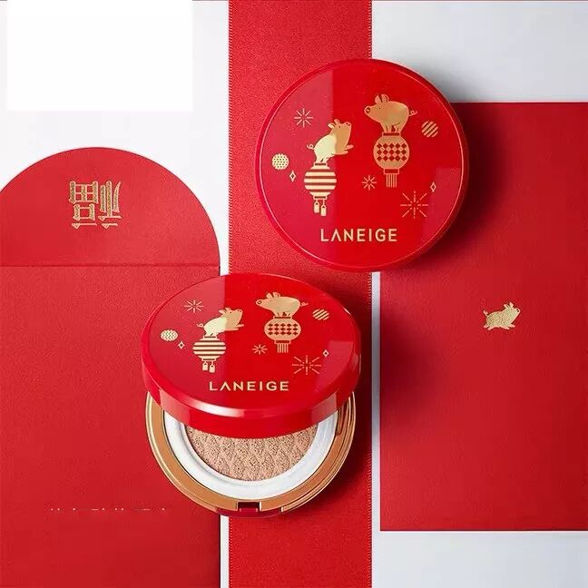 兰芝推出的鸿运限量版礼盒,将小猪、灯笼、礼花等元素融入到包装中,红色作为底色金色勾勒图案,话说各大美妆品牌的新年限定都被这两种颜色承包了啊!